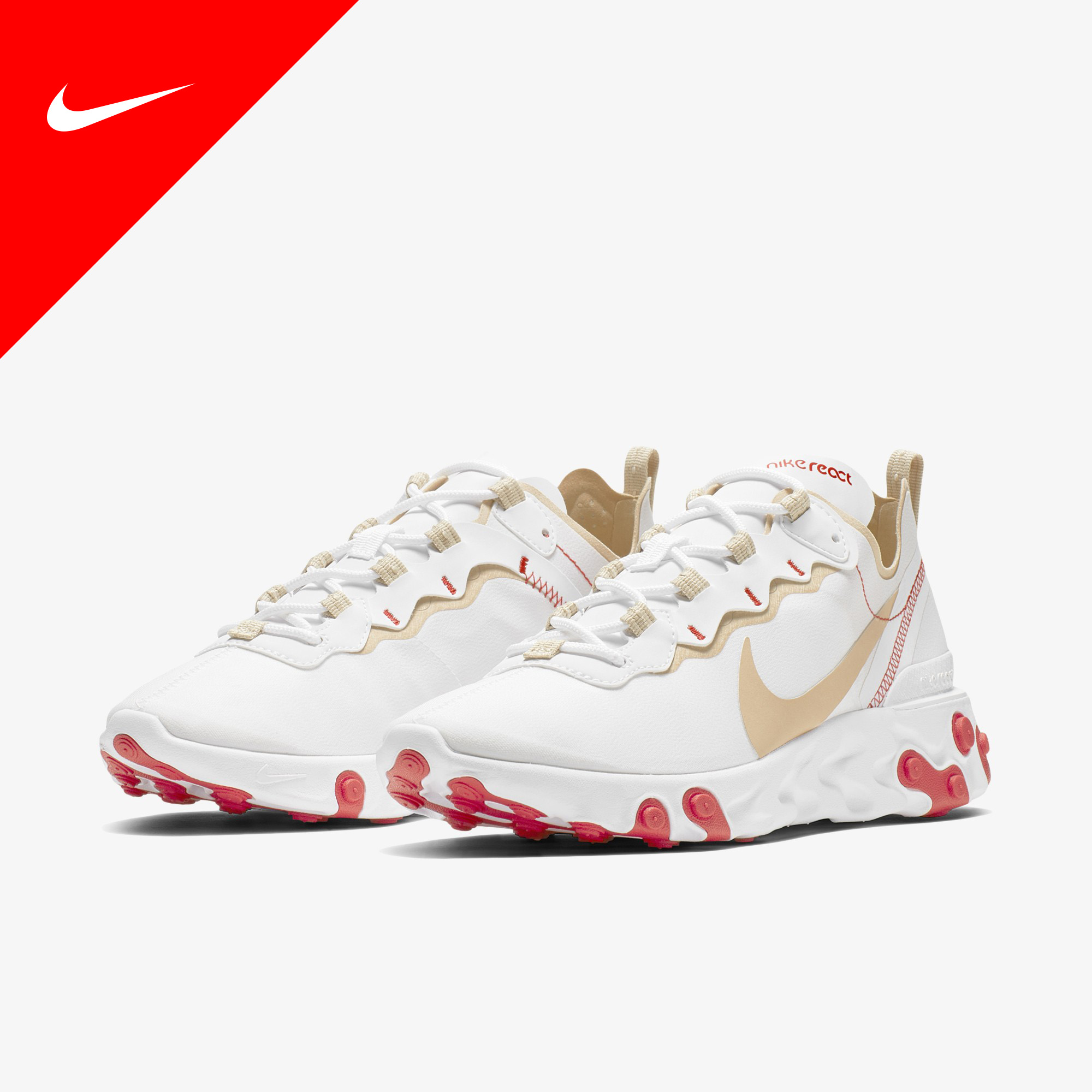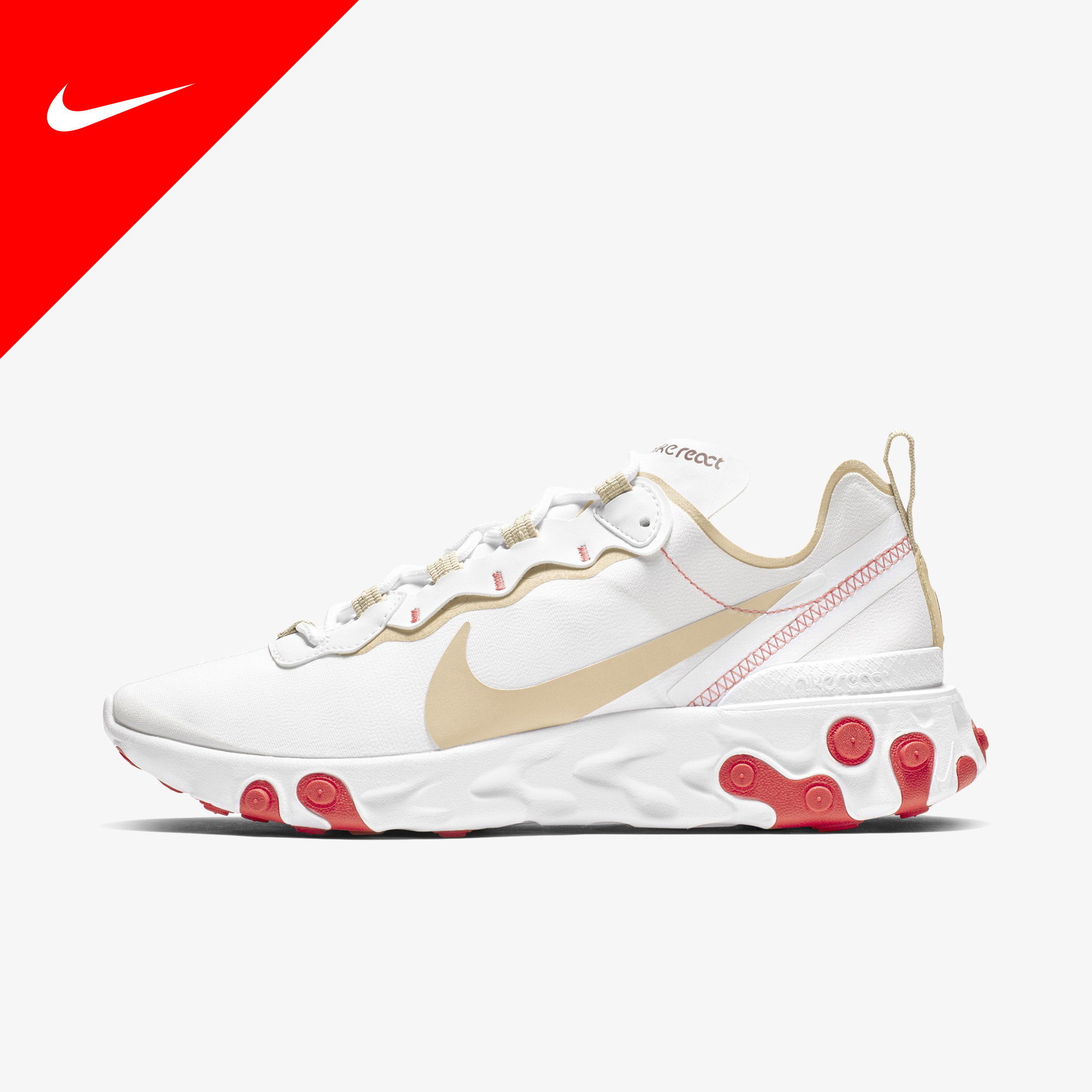 나이키 리액트 엘리먼트 55 제품은 가벼운 텍스타일 갑피의 고광택 처리로 멋스러움 전달, 나이키 리액트 기술로 놀랍도록 매끄럽게, 중창과 밑창의 고무 포드로 내구성과 접지력 우수합니다. 그리고 열가소성 폴리우레탄 힐 클립으로 안정감 탁월합니다.