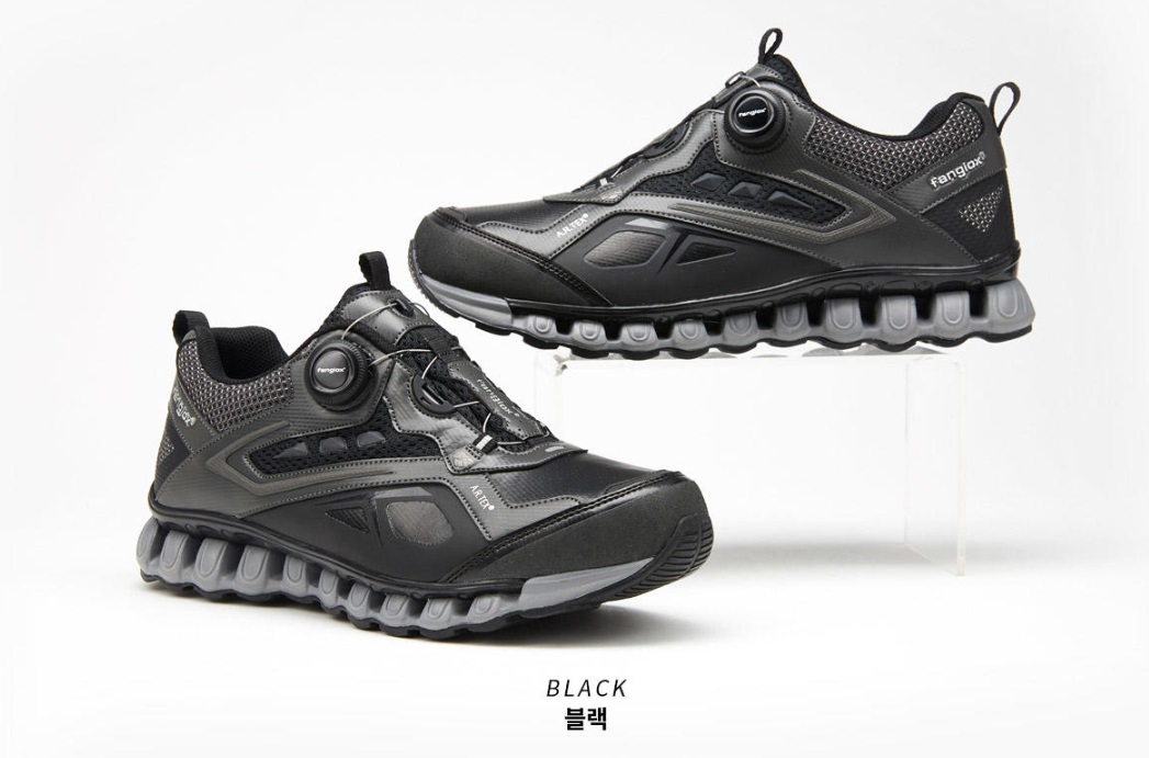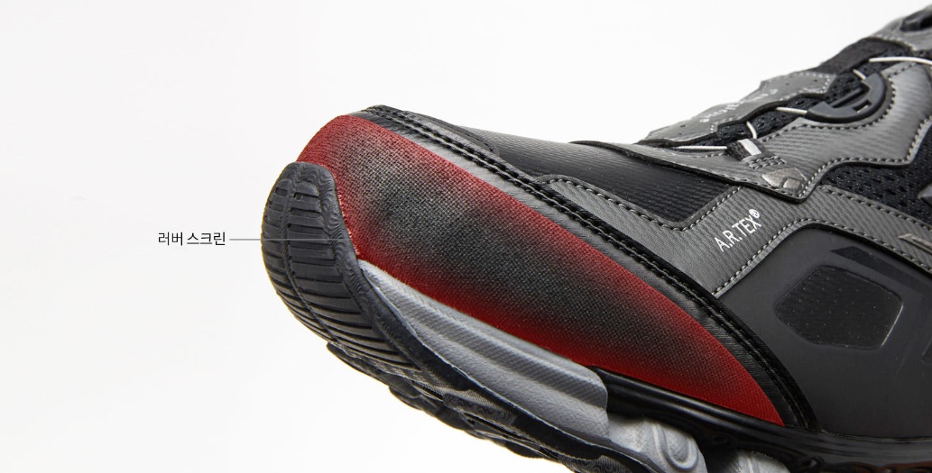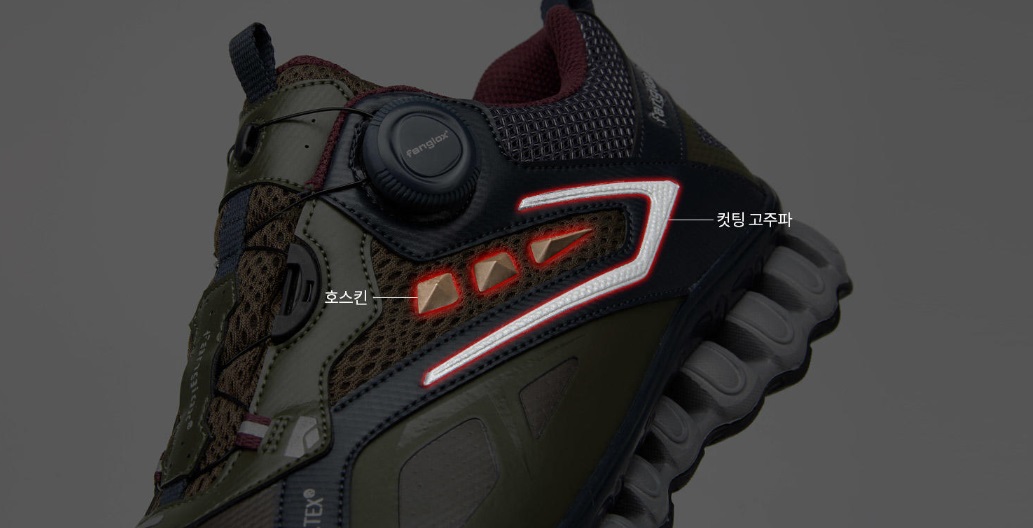 트레킹을 하다보면 불가피하게 생기는 외부의 충격은 생각보다 많이 생깁니다. 발의 측면의 충격을 보완해주기 위해 컷팅 고주파와 단단한 장식인 호스킨 장식을 적용했습니다. 신발의 앞코에는 발을 더욱 견고하게 지지해주기 위해 러버 스크린을 적용했습니다.