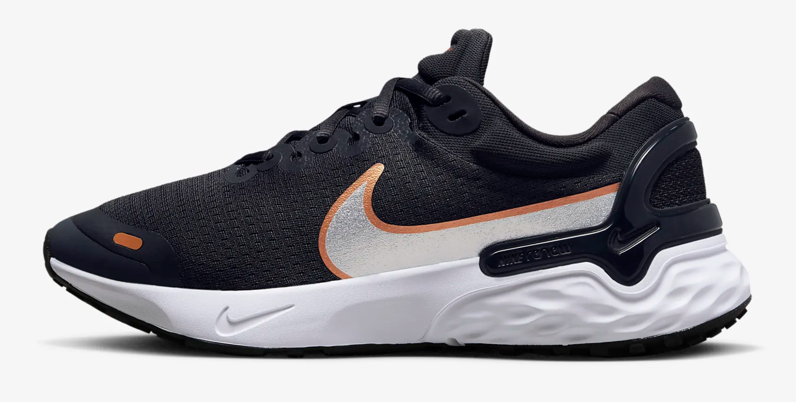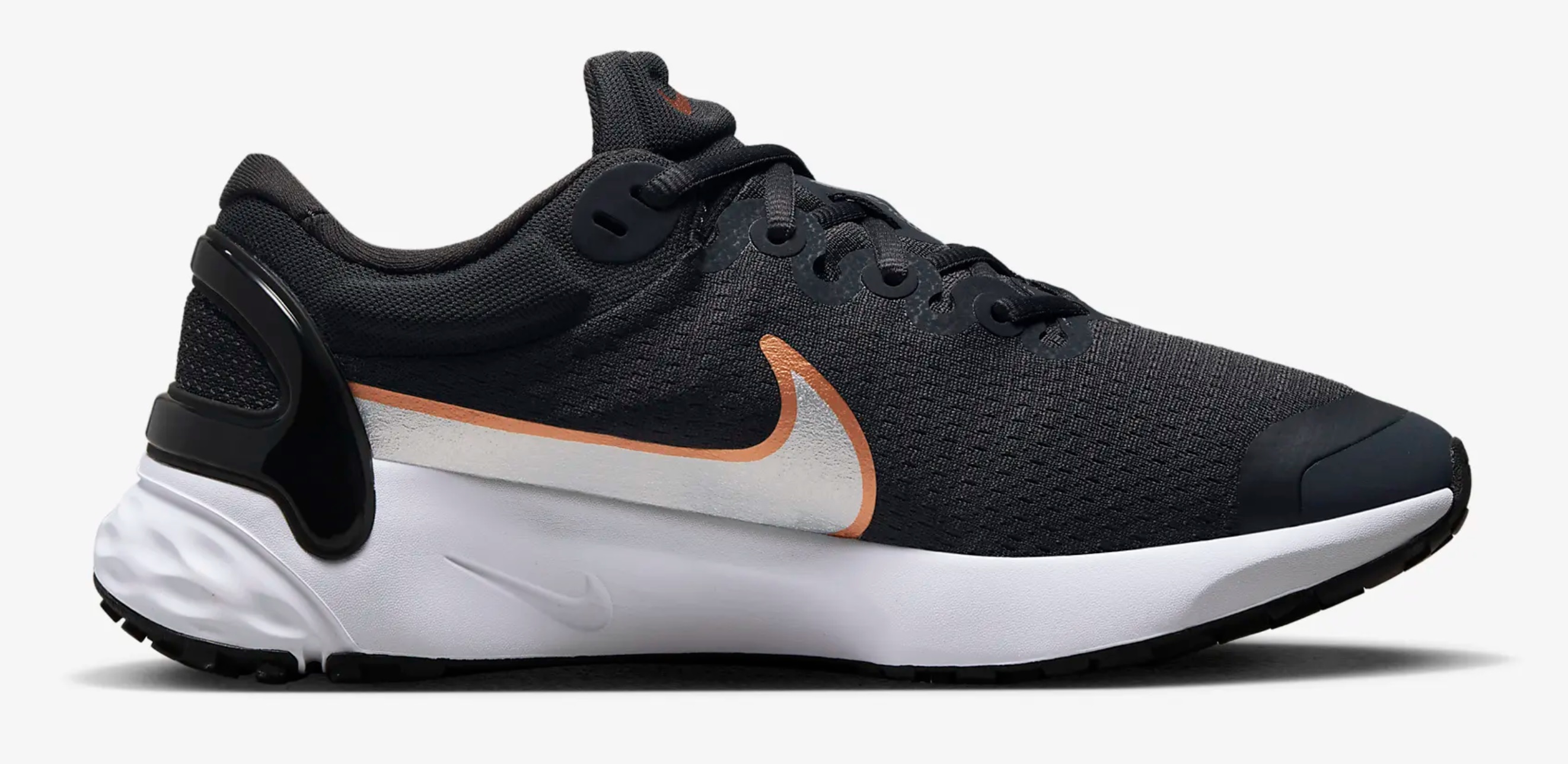 업퍼의 베이스 컬러는 블랙이며, 화이트 색상의 미드솔과 스우시는 운동화의 산뜻함을 더했습니다. 그리고 발목과 발등 부분에는 부드러운 내패딩으로 착화감이 좋습니다. 힐카운터의 사출물은 발목을 안정적으로 잡아주며, 외형상 신발의 화려함을 더해 줍니다.
