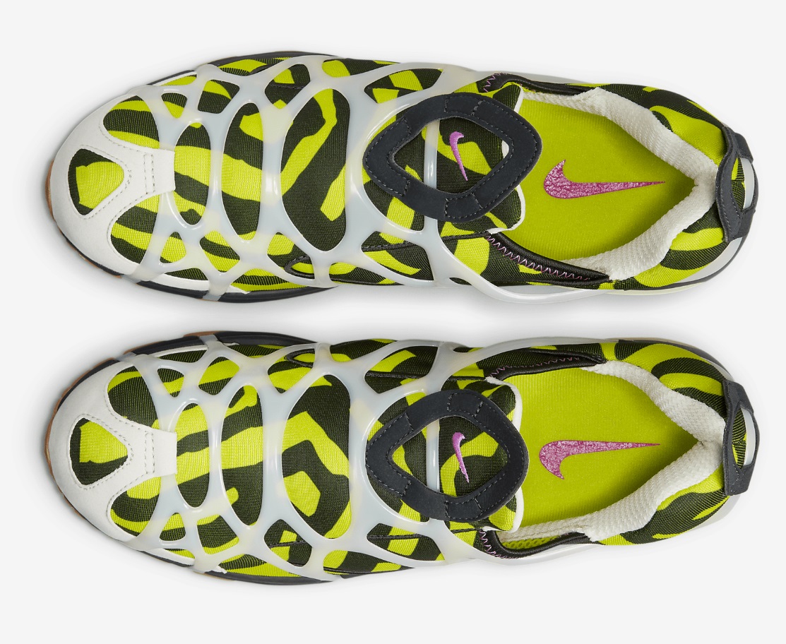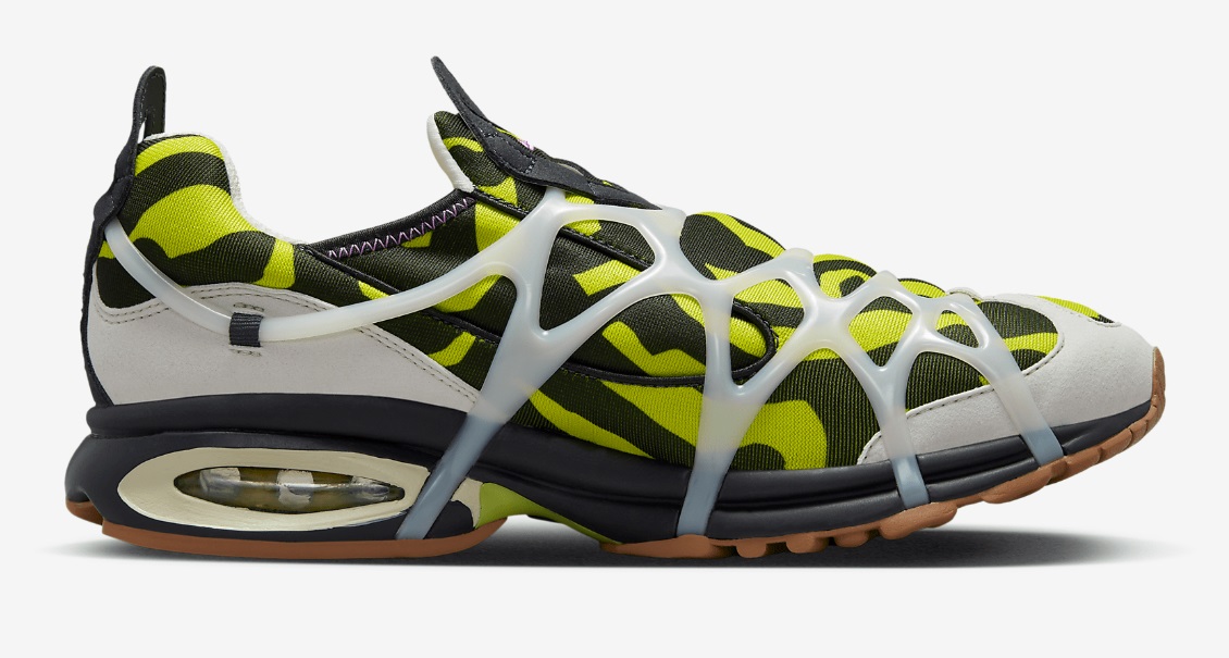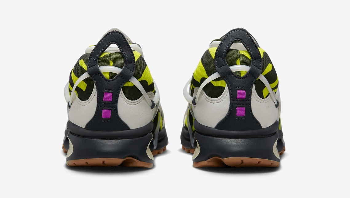 업퍼 컬러는 위장 컬러 처럼 보입니다. 갑피의 텅탑과 힐카운터 탑에는 당김탭을 멋스럽게 디자인 하였습니다. 또한 신발을 신고 벗을때 편리합니다. 그리고 본 모델은 90년대 스키 수트에서 영감을 받은 케이지 서포트 시스템이 스포티한 감성을 더해 줍니다. 투명 나이키 에어 쿠셔닝이 한계를 뛰어넘는 완벽의 역설을 표현합니다. 접지력과 내구성을 더해주는 고무 밑창, 제조국은 인도네시아 나이키 입니다.